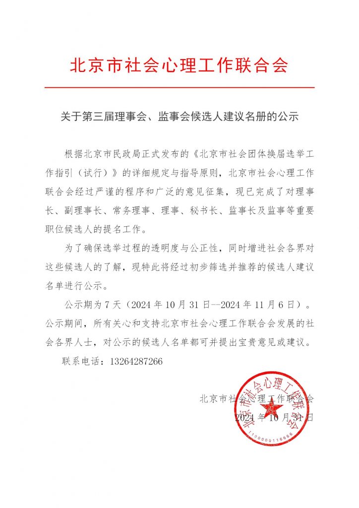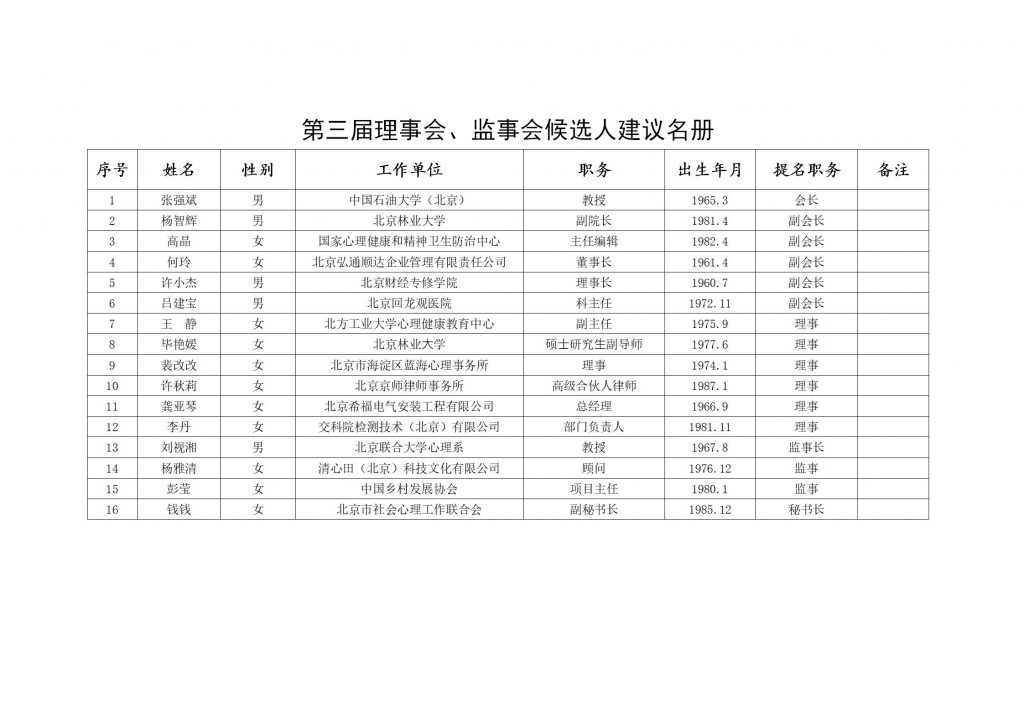 关于第三届理事会、监事会候选人建议名册的公示 – 北京市社会心理工作联合会-凯发k8天生赢家