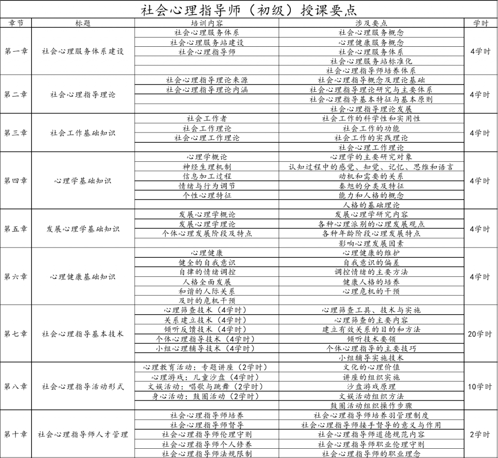 2、教材与教学:《社会心理指导师》教材由北京市社会心理工作联合会主编,国家行政管理出版社出版;初级教学采取线上培训方式,共计56学时。