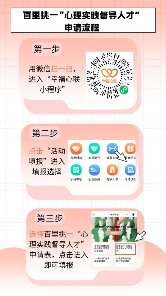 - 材料报送:申报者按要求填写《“百里挑一‘心理实践督导人才’”申请表》,并按申报流程指引图(附件2)提交申报表及个人信息资料。